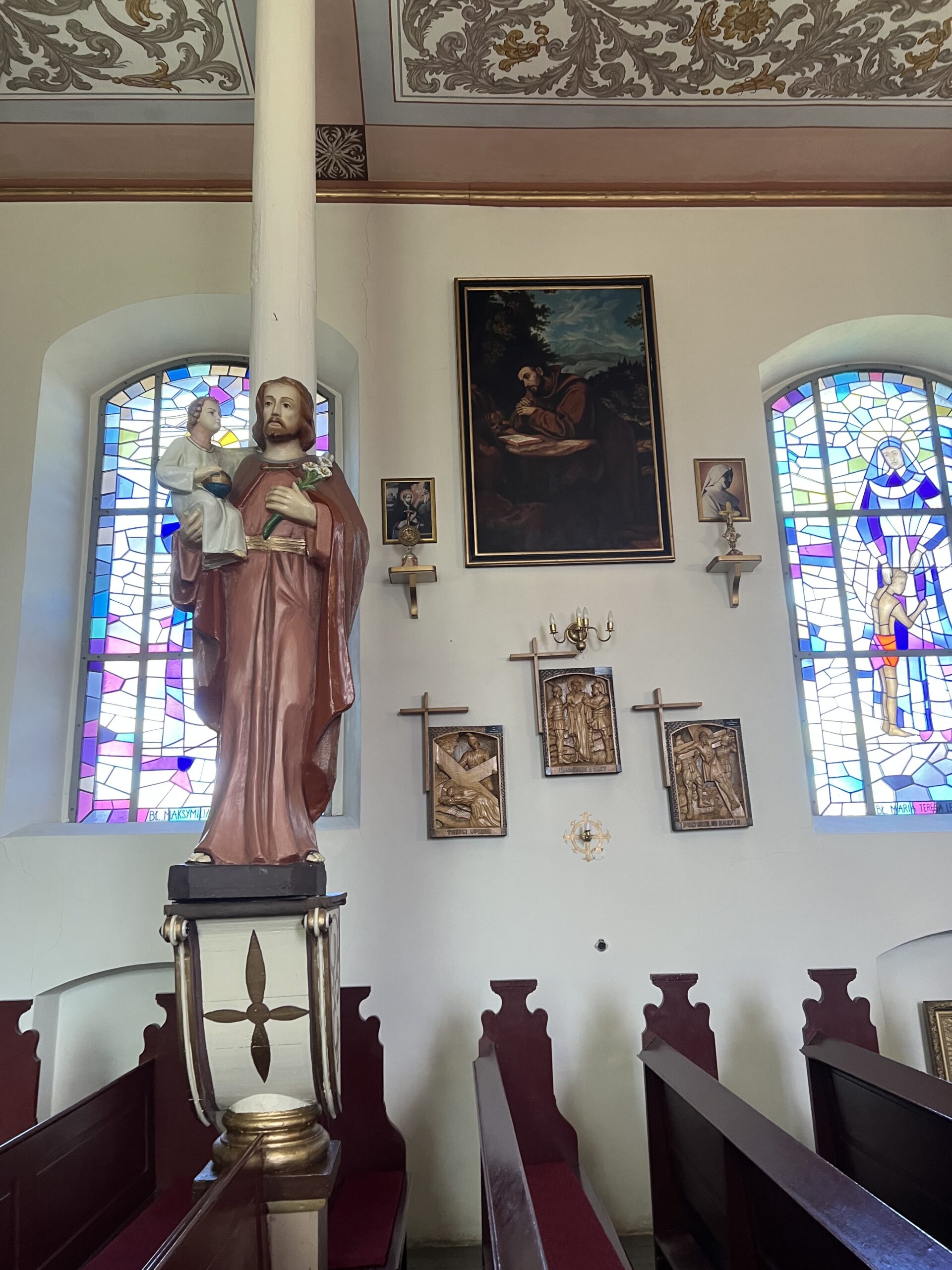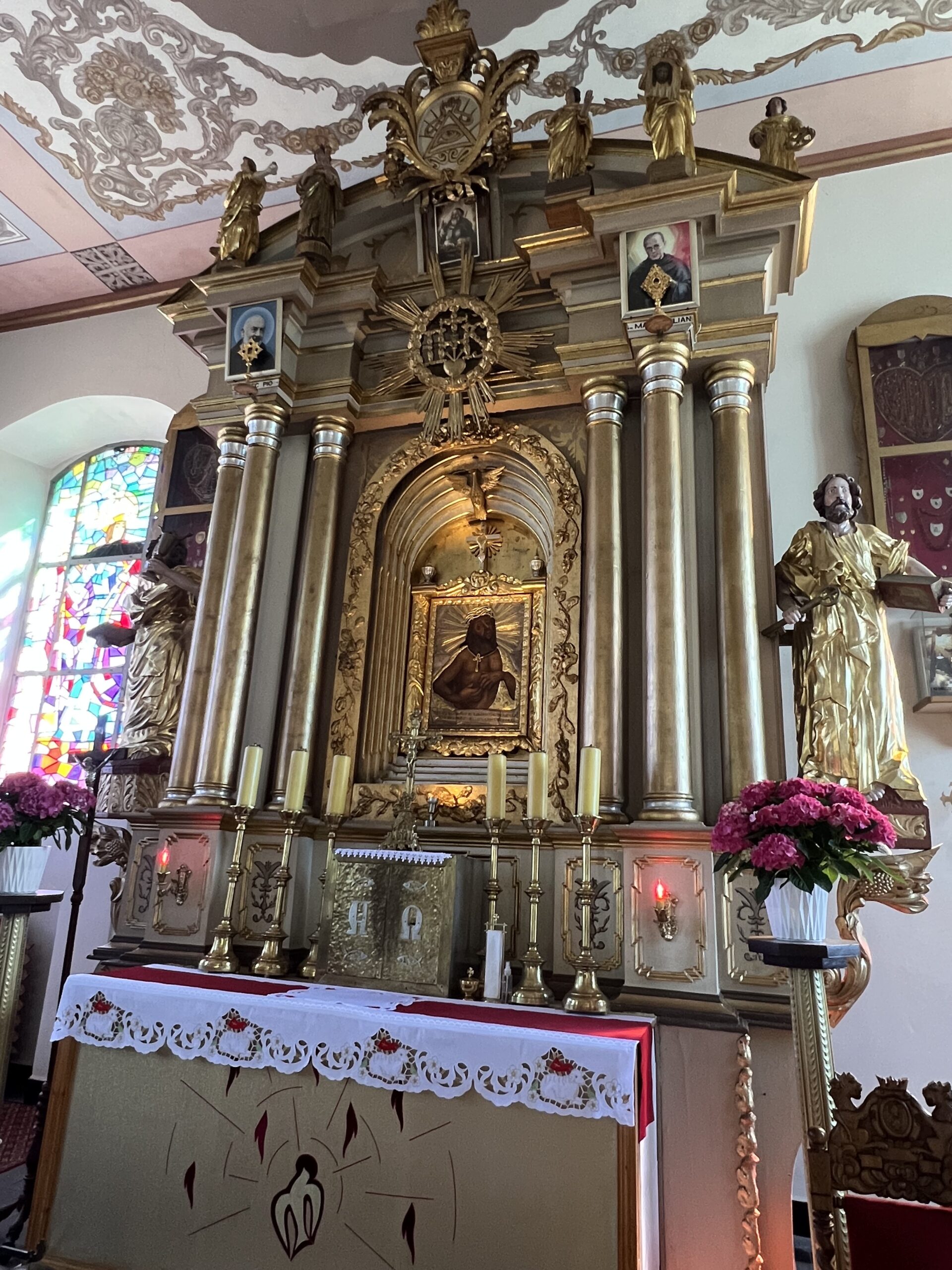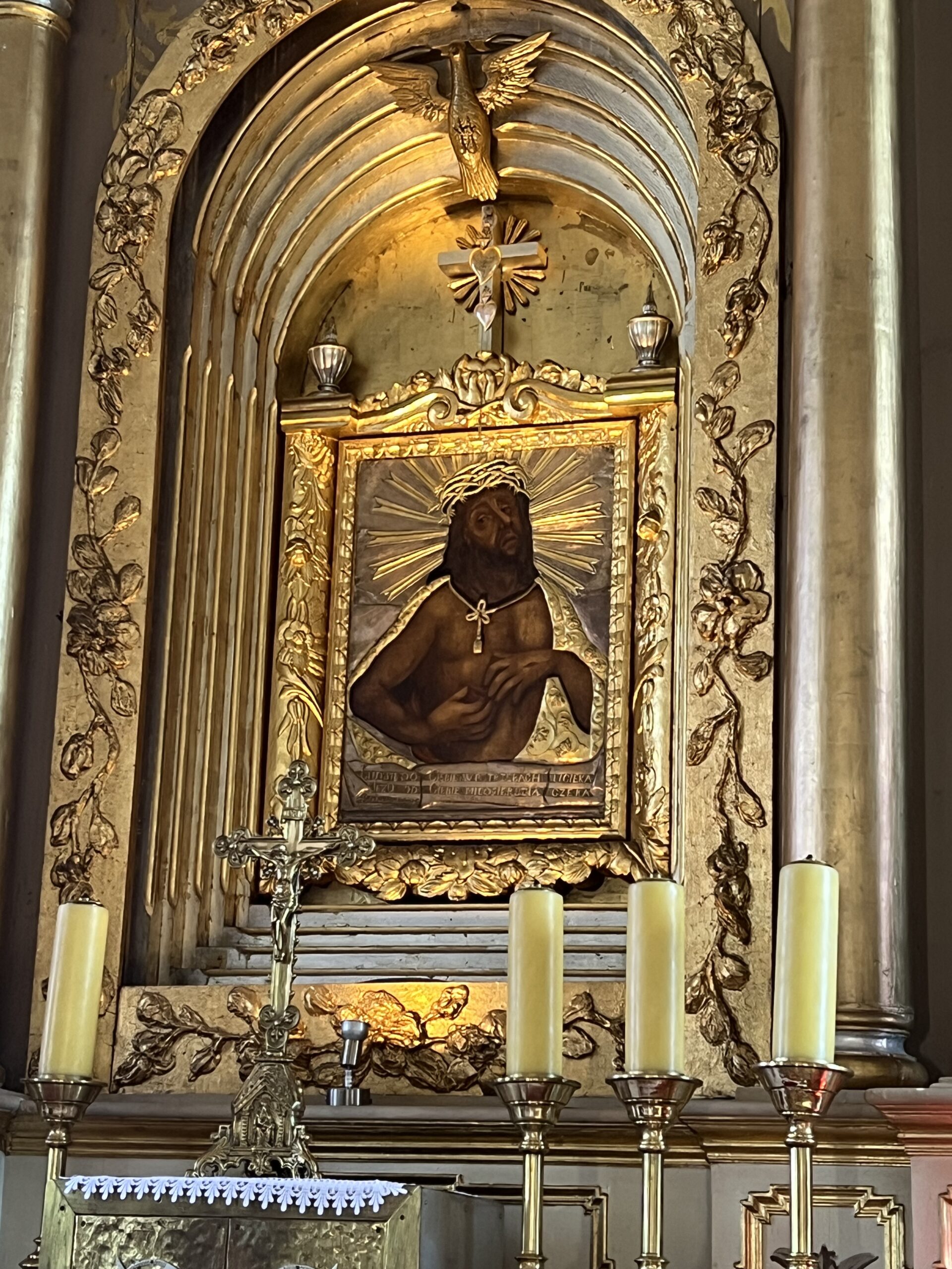 W czasie podróży ks. Kajetan przybliżył nam historię przybycia ludności z terenów Wołynia i Podola na Ziemię Pasłęcką zaraz po II WŚ. Następnie dotarliśmy do Zielonki Pasłęckiej, gdzie usłyszeliśmy historię obrazu Jezusa Tanorudzkiego. Pochodzi on z 1773 r. pod obrazem znajduje się napis „Lud się do Ciebie w potrzebie ucieka. Jezu, od Ciebie miłosierdzia czeka. Roku 1773”. Jak Obraz znalazł się w Zielonce? W dużym skrócie: Otóż do Malborka przywiózł go ostatni Proboszcz Rożyszcz, gdzie wcześniej obraz został przeniesiony z Katedry w Łucku. Po śmierci ks. Proboszcza obraz znalazł się w Ostródzie, a stamtąd do Zielonki przeniósł go ówczesny proboszcz i późniejszy kustosz sanktuarium w Zielonce Pasłęckiej ks. Czesław Drężek. Zachęcam do zapoznania się z całą historią tego obrazu, pytając ks. Kajetana, bo moja opowieść nie odda tego w pełni. Następnie Mszą Świętą w Zielonce w intencji papieża Franciszka oddaliśmy hołd zmarłemu biskupowi Rzymu. Później odmówiliśmy Koronkę do Bożego Miłosierdzia i mieliśmy chwilę czasu na zwiedzanie Sanktuarium i znajdujących się tam relikwii świętych. Nie pojawiłyby się one, gdyby nie obraz Jezusa Tarnorudzkiego, który ułatwił kustoszowi przyznawanie temu miejscu relikwii. Później odwiedziliśmy obecnego kustosza ks. Karola, któremu zaśpiewaliśmy 100 lat, z okazji 40 – lecia święceń kapłańskich. Na jego ręce złożyliśmy ofiarę na rzecz Sanktuarium. Później pojechaliśmy do Gietrzwałdu, gdzie zjedliśmy obiad, następnie mieliśmy czas wolny dla siebie. Pielgrzymkę zakończyliśmy Różańcem pod figurką Matki Boskiej, gdzie znajduje się źródełko. Była to interesująca wyprawa, gdzie mogliśmy poznać ciekawe miejsce i niespotykany obraz Jezusa Tarnorudzkiego. Dziękuję ks. Kajetanowi za zorganizowanie pielgrzymki i bądźcie czujni bo za około miesiąc będzie najprawdopodobniej kolejna pielgrzymka? Dokąd? Bądźcie czujni i słuchajcie ogłoszeń. Więcej zdjęć na stronie internetowej parafii.