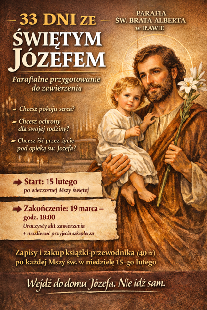 15 lutego w niedzielę po wieczornej Mszy św. będzie miało miejsce pierwsze spotkanie formacyjne: wspólny START do zawierzenia się św. Józefowi. Nasze przygotowania ku konsekracji potrwają do 19 marca – do uroczystości św. Józefa, kiedy to w ramach wieczornej Mszy Świętej dokonamy uroczystego aktu zawierzenia. Każdy uczestnik potrzebuje własnej książki-przewodnika (do nabycia 15 lutego po każdej Mszy św.-40 zł), podejmuje sam codzienną, krótką modlitwę z rozważaniami, spotyka się z nami przez kolejne  4 niedziele na wspólnej formacji.